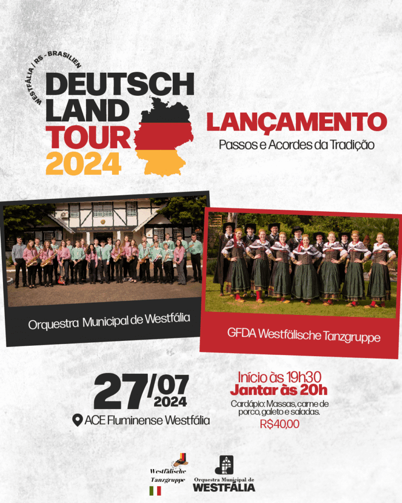 De forma especial, a Orquestra Municipal de Westfália e o Grupo de Danças Folclóricas Alemãs Westfälische Tanzgruppe lançarão a turnê “Deutschland Tour 2024” – Passos e Acordes da Tradição. A programação ocorrerá no dia 27 de julho (sábado), a partir das 19 horas, na Associação Cultural e Esportiva (ACE) Fluminense, no Centro do Município. Cartões para o jantar de lançamento da turnê já estão sendo comercializados, ao valor de R$ 40,00 por pessoa, e são limitados. O cardápio será massas, carne de porco, galeto e saladas. Os cartões podem ser adquiridos com integrantes dos grupos envolvidos. Sobre a turnê A turnê “Deutschland Tour 2024” acontece de forma inédita, por meio de parceria entre a Orquestra Municipal e o Westfälische Tanzgruppe. Os grupos representarão o município de Westfália na Alemanha de 11 a 26 de agosto.