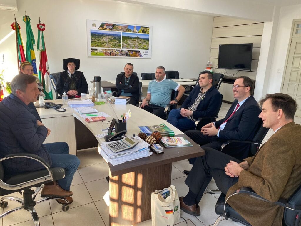 Na tarde de sexta-feira, dia 19 de julho, o município de Westfália recebeu autoridades para deliberar sobre os projetos comemorativos ao Bicentenário da Imigração Alemã no Brasil. A visita ocorreu no Gabinete Municipal e contou com a presença do cônsul-geral da Alemanha no Rio Grande do Sul (RS) e Santa Catarina (SC), Marc Bogdahn, acompanhado do presidente da Comissão Oficial do Bicentenário da Imigração Alemã no RS, Rafael Gessinger. A visita reforçou a importância da parceria entre as autoridades para o sucesso das comemorações, destacando o compromisso de todos em promover a cultura e a história alemã no Rio Grande do Sul. Durante o encontro, ainda foram divulgados os projetos do Município para celebrar os 200 anos da Imigração Alemã no Brasil, sendo que as iniciativas incluem concursos, apresentações culturais e outras atividades que visam resgatar e valorizar a herança cultural alemã que influenciou a região. Também acompanharam a visita o secretário de Educação, Cultura, Turismo e Desporto, Gustavo Sieben, o maestro da Orquestra Municipal de Westfália, Lucas Eduardo Grave, o produtor cultural Marcelo Brentano e integrantes do Grupo de Danças Folclóricas Alemãs Westfälische Tanzgruppe.