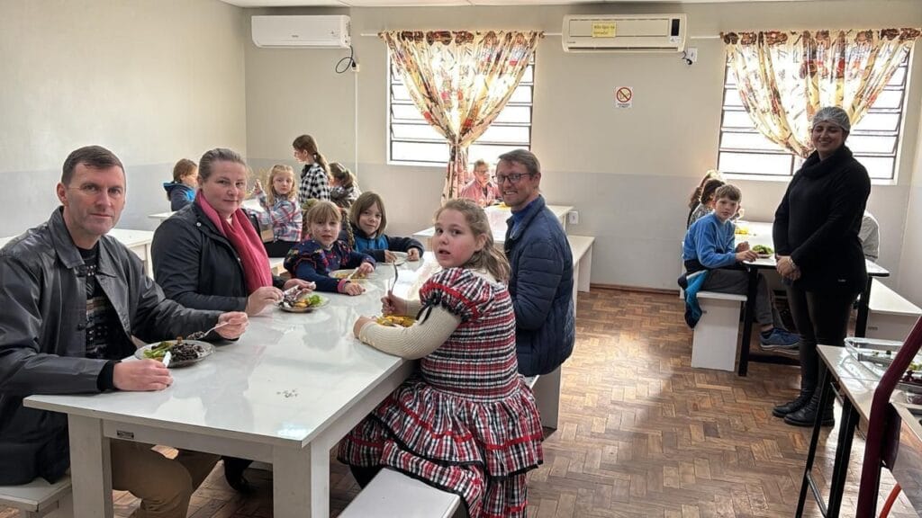 A manhã desta quarta-feira (25) foi de integração e escuta na EMEF Vila Schmidt. A Administração Municipal de Westfália realizou uma visita ao Centro de Turno Inverso da escola, com o objetivo de conhecer de perto a estrutura do espaço, acompanhar o trabalho dos profissionais e o dia a dia dos alunos, além de ouvir as demandas do educandário. Participaram da visita o prefeito César Juliano Bloemker, a vice-prefeita Simone Landmeier e o secretário municipal de Educação, Roque Lindemann. Durante o encontro, o grupo teve a oportunidade de percorrer as instalações da escola, interagir com estudantes e servidores, e acompanhar o momento do almoço, parte importante da rotina das crianças no contraturno escolar. De acordo com o prefeito Bloemker, a visita reforça o compromisso da gestão com uma educação de qualidade e com a valorização dos ambientes escolares. “Estar presente nas escolas é essencial para entender de forma real as necessidades e também reconhecer o bom trabalho que vem sendo feito”, destacou. A iniciativa faz parte de um calendário de visitas às instituições de ensino do município, com o intuito de manter o diálogo constante entre a Administração Municipal e a comunidade escolar, contribuindo para o aprimoramento das políticas públicas educacionais.