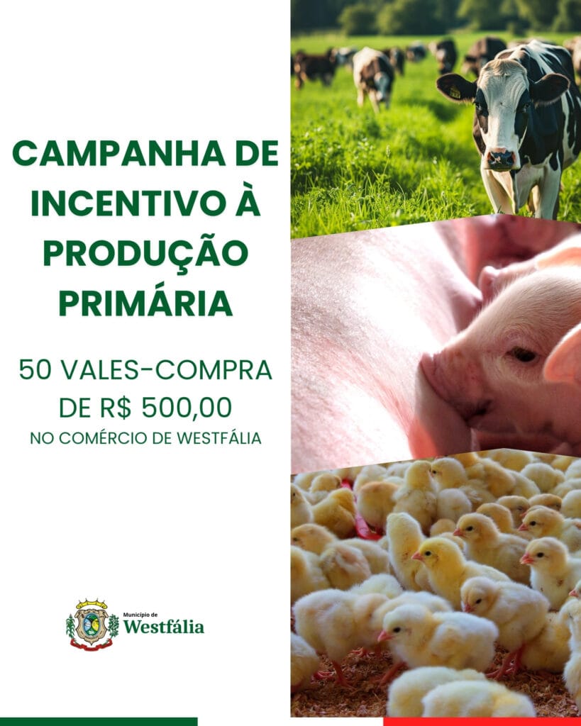 A Prefeitura de Westfália reedita a Campanha de Incentivo à Produção Primária, iniciativa aprovada pela Câmara de Vereadores e instituída pela Lei nº 2.273, de 15 de janeiro de 2026. A ação terá o sorteio de 50 vales-compra no valor de R$ 500,00 cada, que deverão ser utilizados exclusivamente no comércio local.