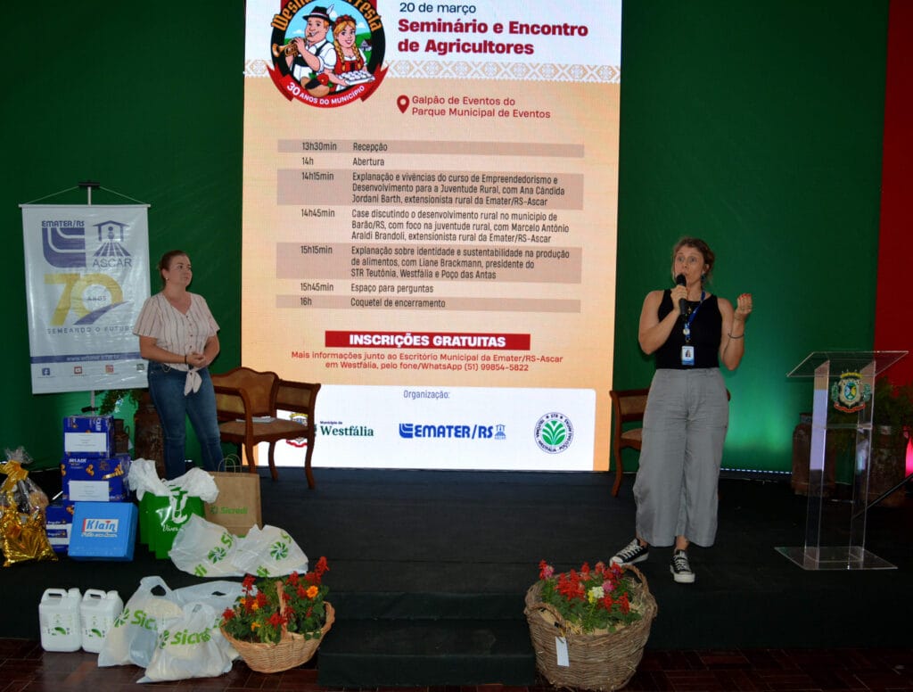 A programação iniciou com a explanação e vivências do curso de Empreendedorismo e Desenvolvimento para a Juventude Rural, com a extensionista da Emater/RS-Ascar, Ana Cândida Jordani Barth. Na sequência, o também extensionista Marcelo Antônio Araldi Brandoli apresentou case sobre o desenvolvimento rural no município de Barão, com foco na juventude rural. A programação contou ainda com a palestra sobre identidade e sustentabilidade na produção de alimentos, ministrada por Liane Brackmann, presidente do Sindicato dos Trabalhadores Rurais de Teutônia, Westfália e Poço das Antas.
