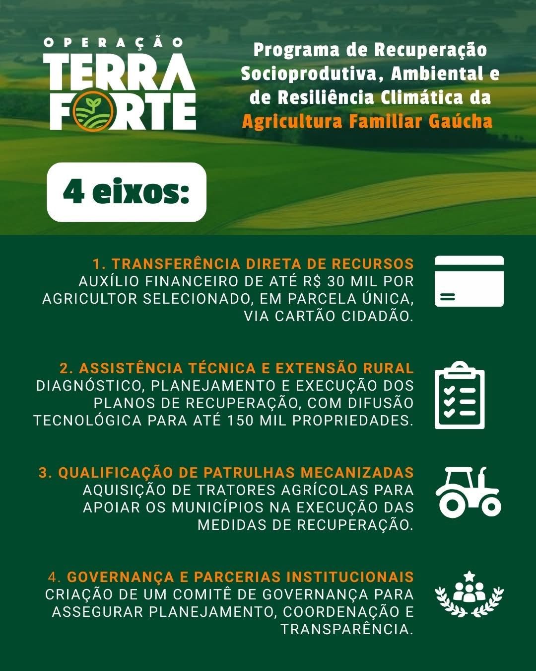 A Emater/RS-Ascar, com o apoio da Secretaria da Agricultura e Meio Ambiente de Westfália, informa que estão abertas, até o dia 17 de outubro, as inscrições para o Programa de Recuperação Socioprodutiva, Ambiental e de Resiliência Climática da Agricultura Familiar Gaúcha – Operação Terra Forte, uma iniciativa do Governo do Estado do Rio Grande do Sul, por meio da Secretaria de Desenvolvimento Rural em parceria com a Emater.
